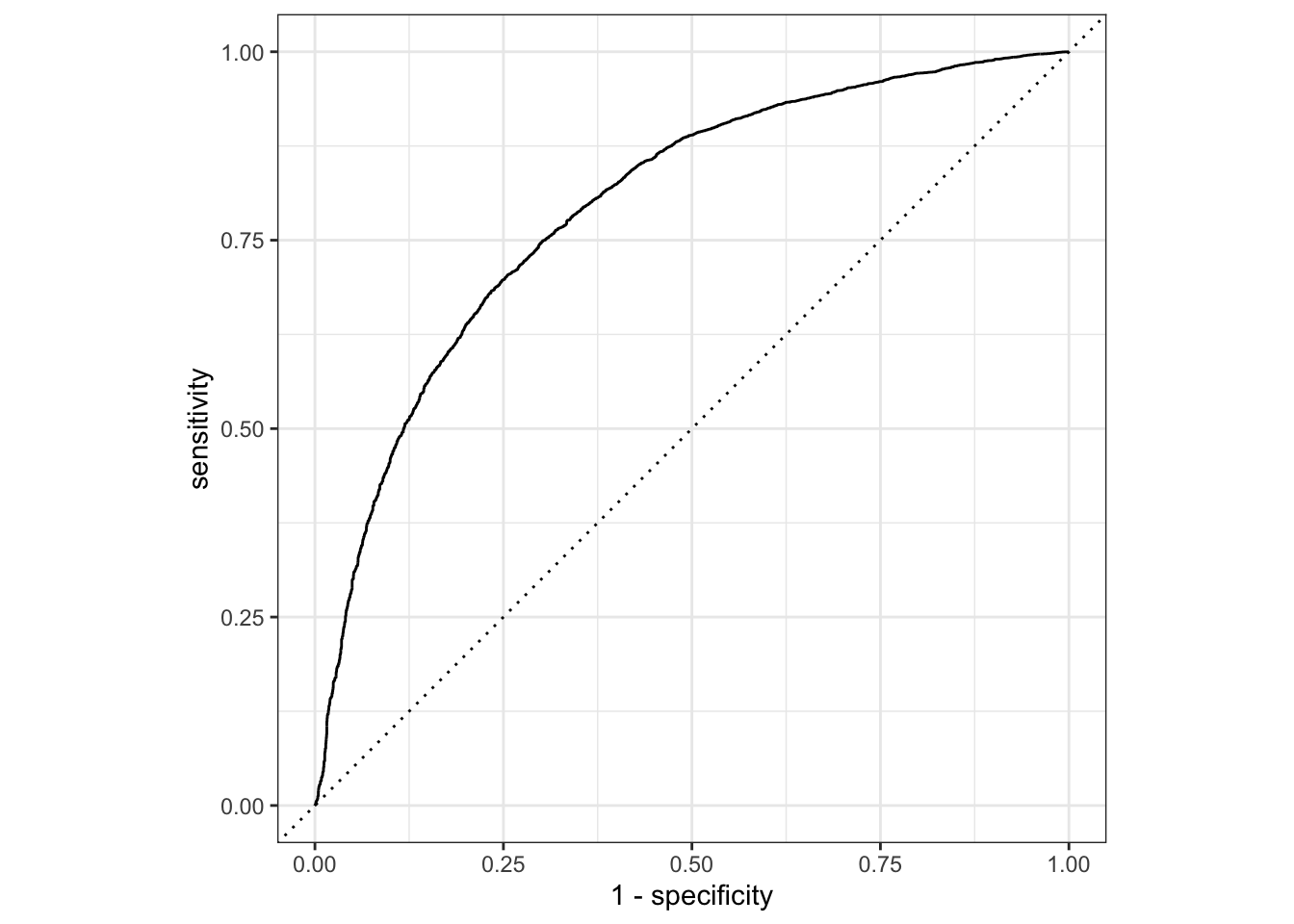 prediccion_auc <-predict(lm_results, entrenamiento, type ="prob")resultados_prueba_auc <-cbind(prediccion_auc, datos_entrenamiento) |>tibble()roc_auc(resultados_prueba_auc,truth = PYALC,`.pred_Sí ha consumido`,event_level ="second")