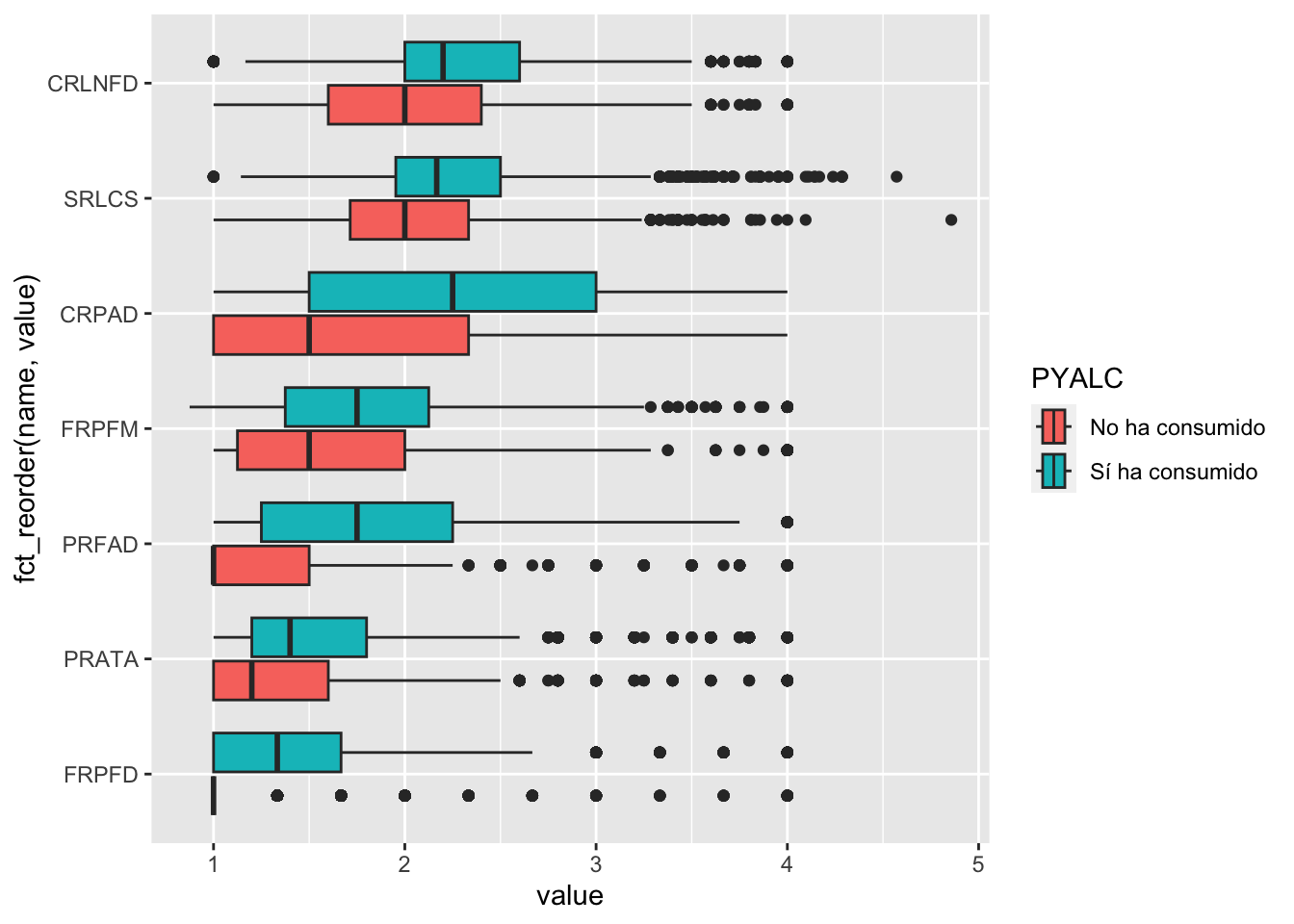 mini_datos |>select(PYALC,factores_de_riesgo) |>pivot_longer(-PYALC) |>ggplot(aes(value, fct_reorder(name, value), fill = PYALC)) +geom_boxplot()